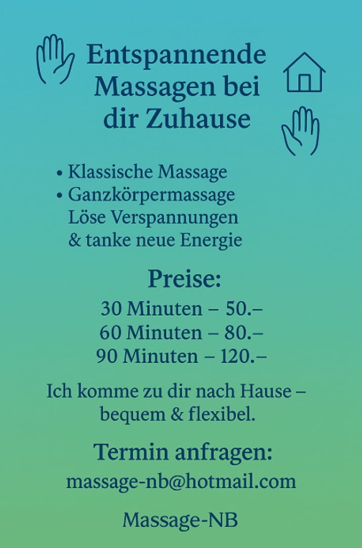 Tu veux te déconnecter, te détendre et faire le plein d'énergie - sans quitter la maison ? Je te propose des massages classiques bienfaisants et des massages complets du corps directement chez toi.